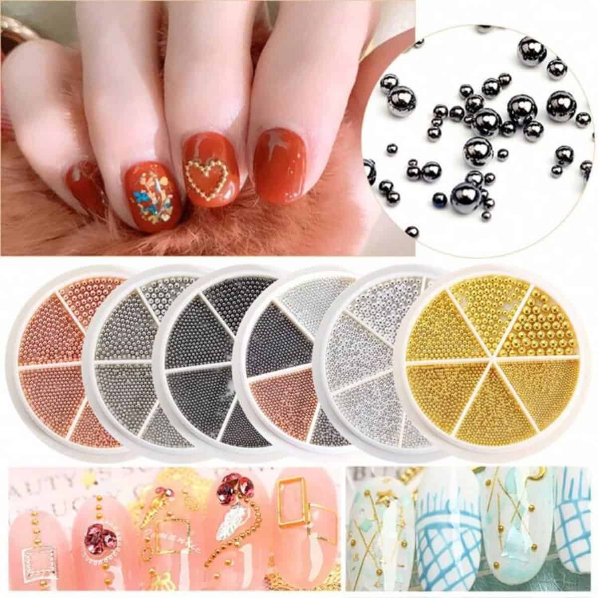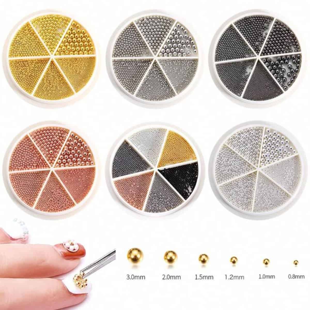 1. Nail Art Beads Set – Nail Art Caviar Beads for Nail DIY Art Decoration, Multi Size 3D Nail Steel Beads for Nail Decoration,Please protect it with top coat in the last step to avoid color oxidation and discoloration